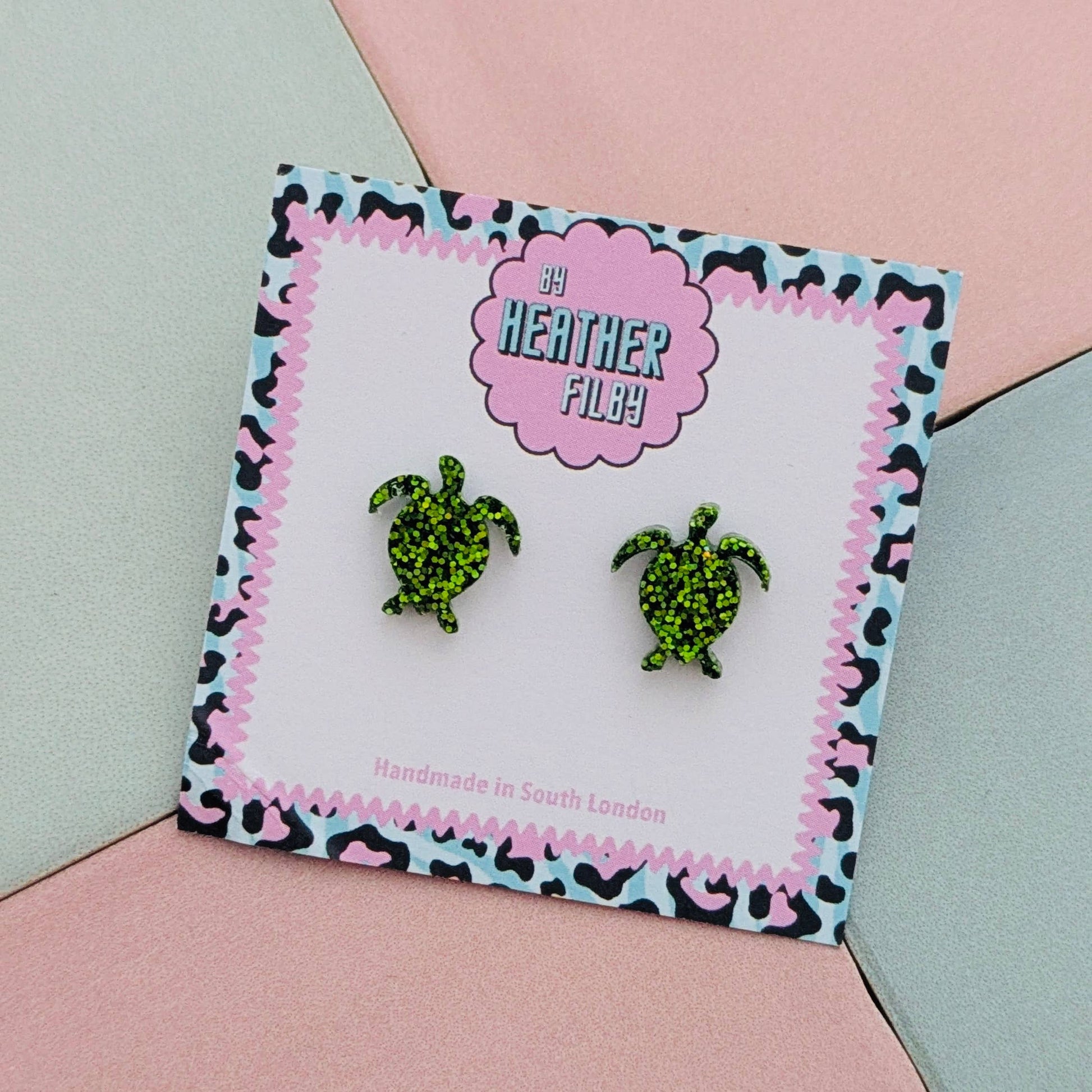 Introducing our exquisite Green Turtle Stud Glitter Earrings, the perfect accessory for any sea lover. These charming earrings feature a beautifully detailed green turtle design, symbolizing wisdom, endurance and patience. The glitter embellishment adds a touch of sparkle and whimsy, capturing the light and reflecting the beauty of the ocean. Crafted with precision and care, these stud earrings are a stunning representation of the beloved sea creature. Whether you're looking for a unique gift or simply want to add a touch of ocean-inspired beauty to your jewellery collection, these Green Turtle Stud Glitter Earrings are sure to make a statement.
